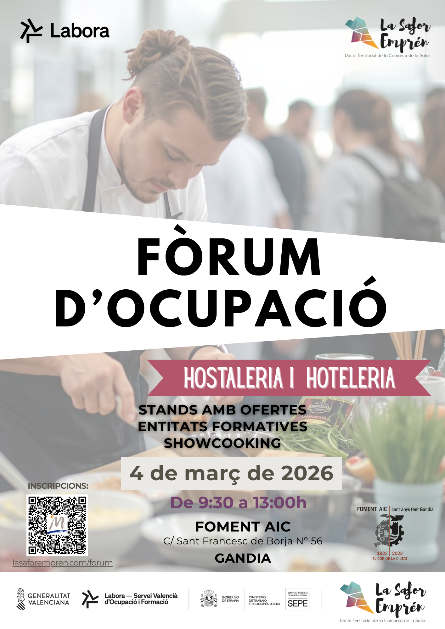 El pròxim 4 de març de 2026 se celebrarà a Foment AIC de Gandia el Fòrum d’Ocupació d’Hostaleria i Hoteleria, una iniciativa impulsada en el marc del Pacte Territorial La Safor Emprén.