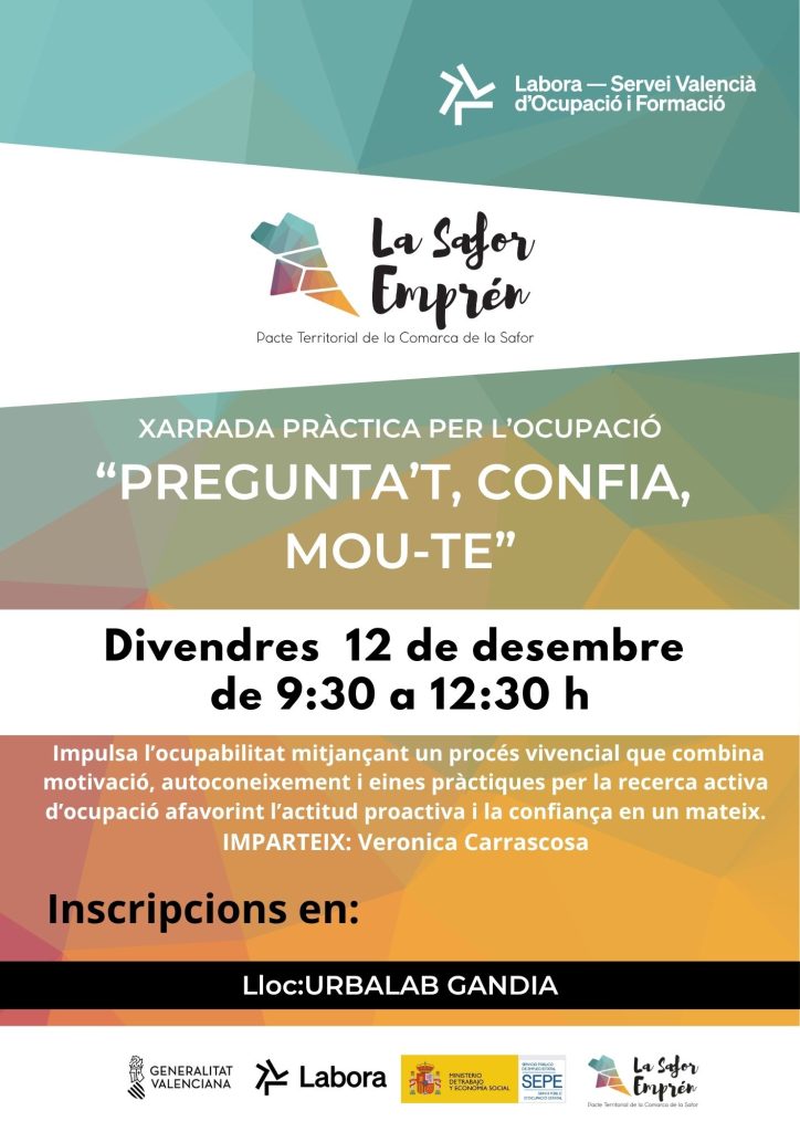 Dins del programa de Llançadora Ocupacional de la comarca de La Safor, s’ha tornat a organitzar el taller pràctic “Pregunta’t, confia i mou-te” de la mà de la professional Verónica Carrascosa, Coach Executiva i d’Equips. Després de l’éxit de participació en el taller realitzat a Oliva i a Tavernes de la Valldigna. S’ha organitzat una nou taller a Gandia el pròxim 12 de desembre a les instal·lacions d’ UrbalabGandia.